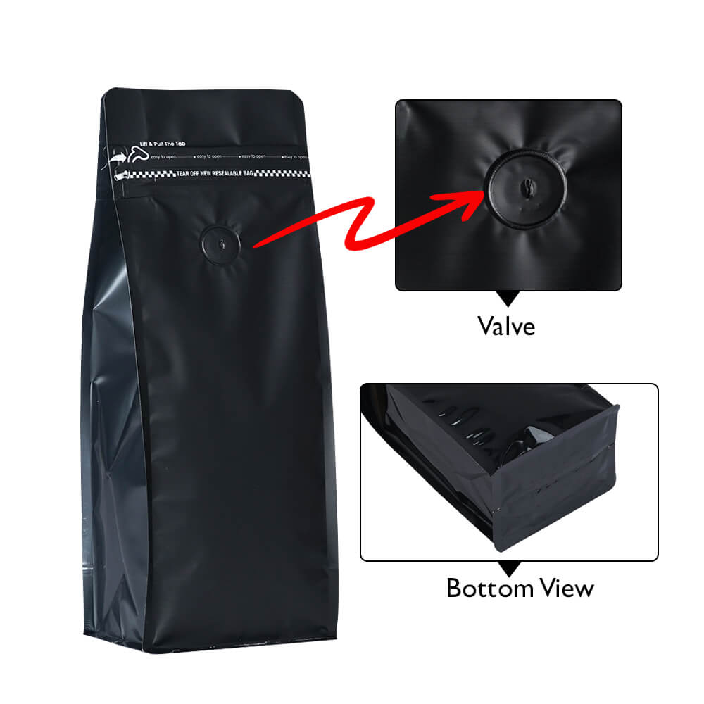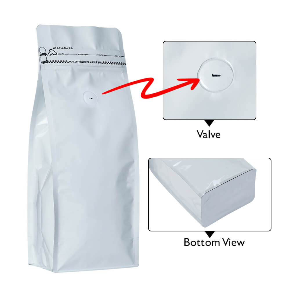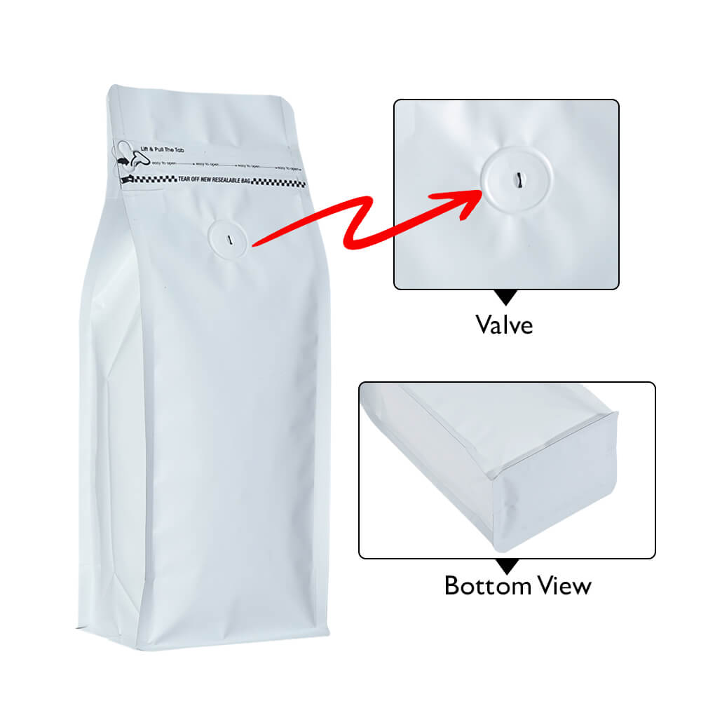 Flat bottom pouches with a tear off zip are a newer style of packaging which combines a stand-up pouch and side gusset bag. This pouch is heat sealed at the top after filling and the customer can use the tear off zip to access the product and reseal the zip. This pouch has a brick like appearance once the product has been filled. They are available with or without a valve for coffee bean breathing. They help give your product a premium look on the selves of competitive markets.